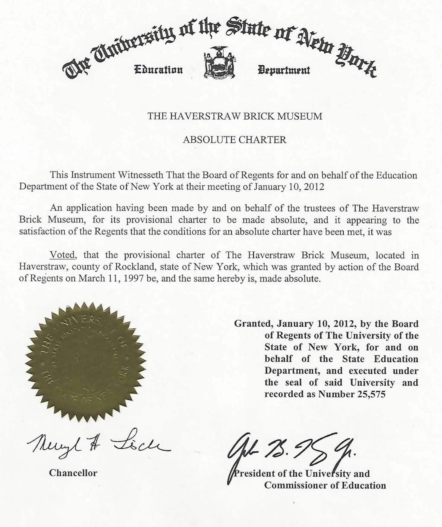 On March 11, 1997, the group achieved another milestone when the Museum was granted its temporary charter, and in 2012, its Absolute Charter from the Board of Education by the Board of Regents of the University of the State.