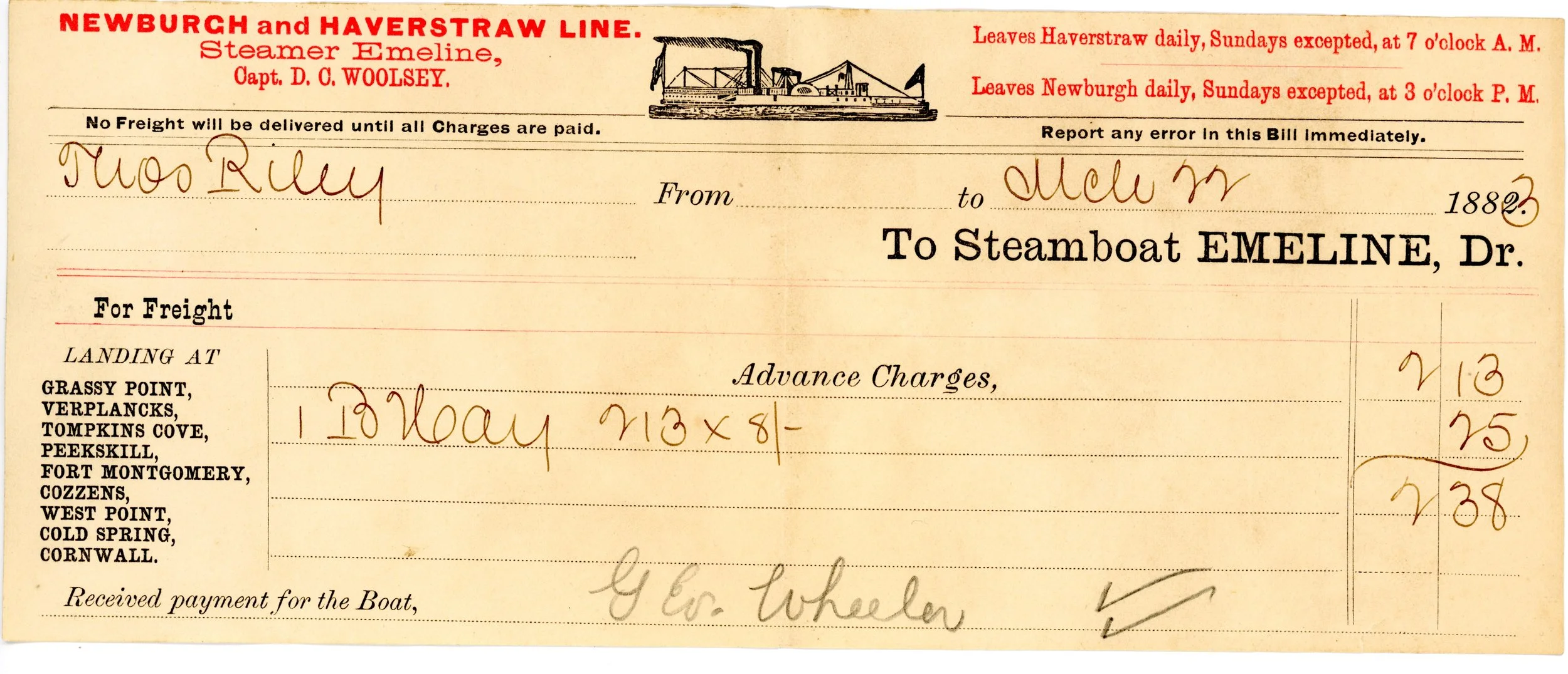 Emeline Steamboat Freight Receipt, Sullivan Collection, ©Haverstraw Brick Museum Archives.